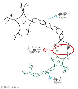 아래의 왼쪽 사진은 뉴런(신경세포) 사진입니다. 인간의 뇌는 약 천억개의 뉴런으로 이루어져 있는데요, 이 수많은 뉴런은 신경 말단에서부터 뇌까지 곳곳에서 자신의 역할을 수행합니다. 오른쪽 그림을 보면 시냅스라는 것이 나오는데, 신경 말단에서 자극을 받으면 뉴런과 뉴런 사이의 연결 부위인 시냅스에서 화학 물질이 나와 전위 변화를 일으킵니다. 전위가 임계 값을 넘으면 다음 뉴런으로 신호를 전달하고, 임계 값에 미치지 못하면 아무것도 하지 않습니다.