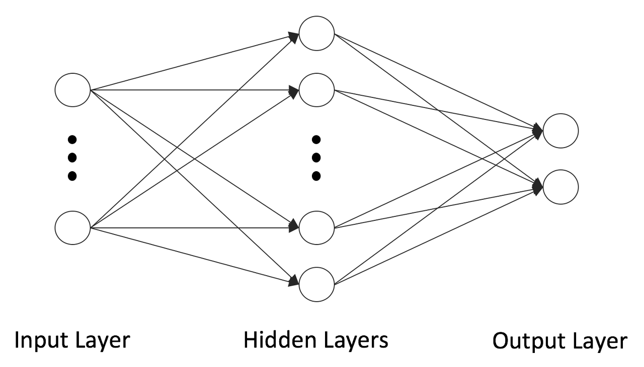 인공 신경망은 일반적으로 아래의 그림과 같이 입력층(Input layer), 은닉층(Hidden layers), 출력층(Output layer)으로 구성되어 있으며 각 층에 포함된 뉴런(노드)들이 가중치를 통해 연결되어 있습니다.